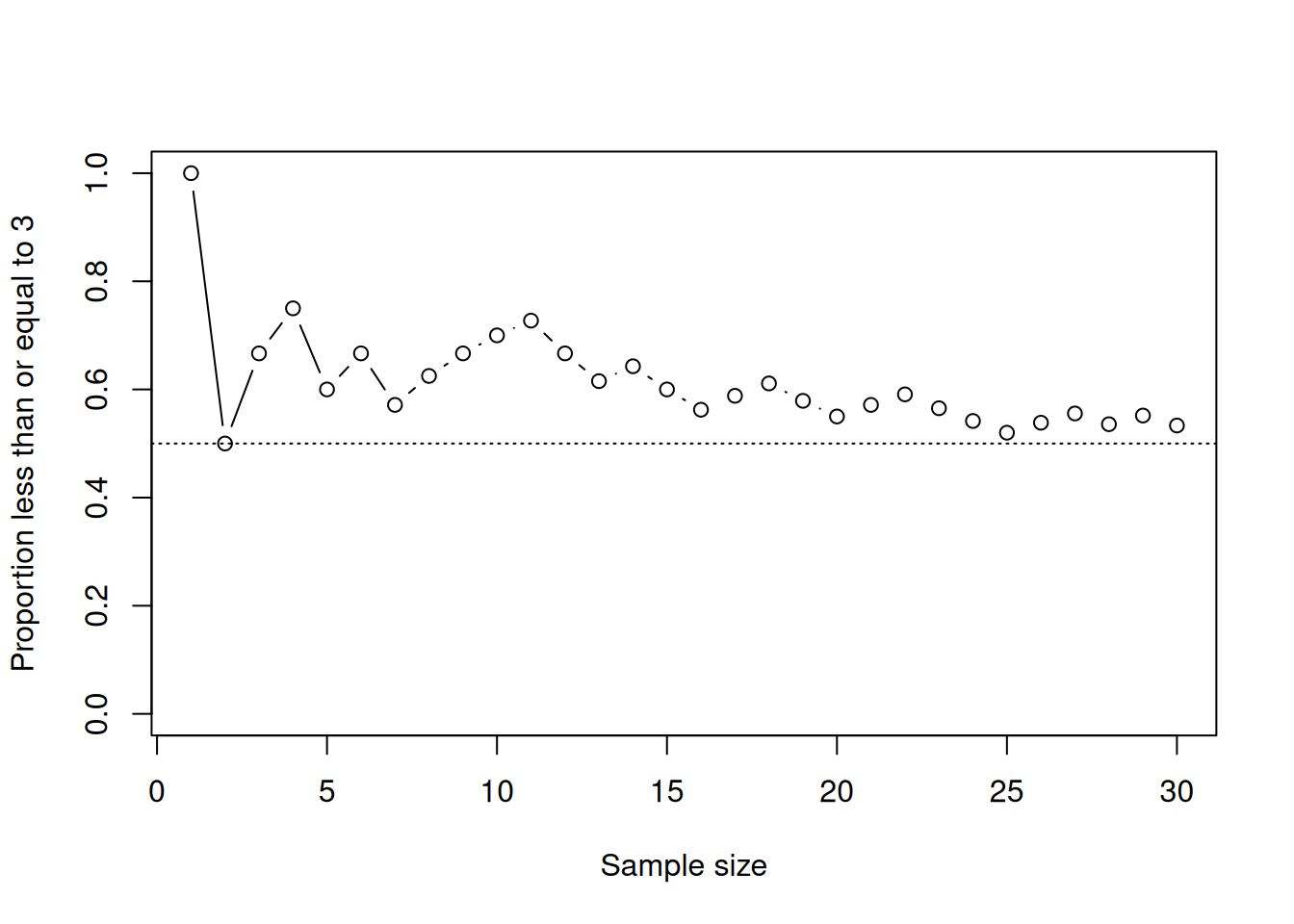 xlab = "Sample size", ylab = "Proportion less than or equal to 3")