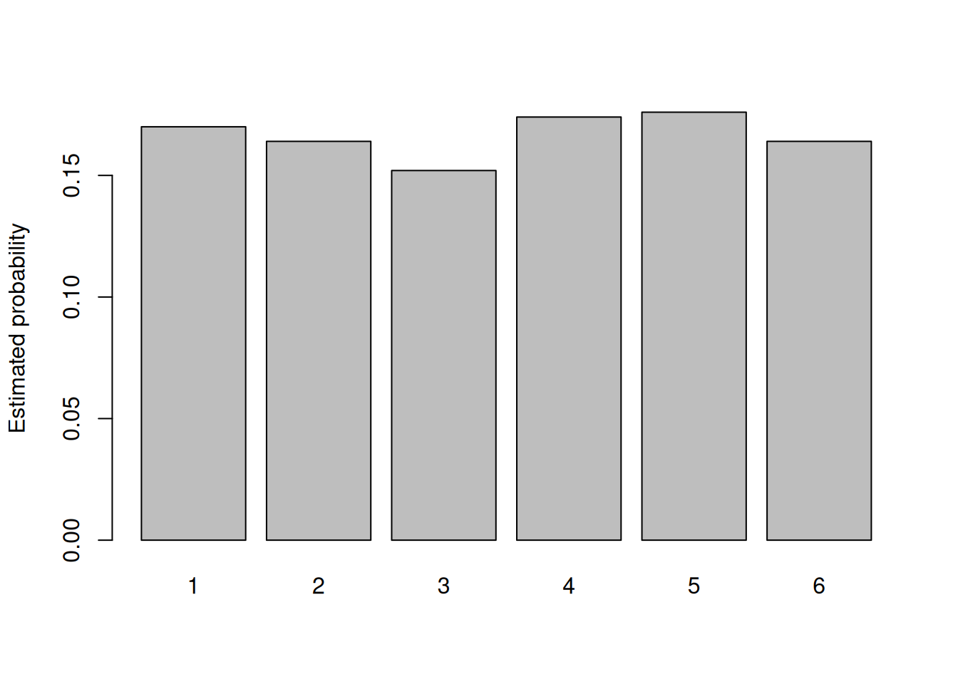 #> [1] 0.164The following code performs the calculation of the estimated probability for all values from 1 to 6 and plots them in a bar plot.